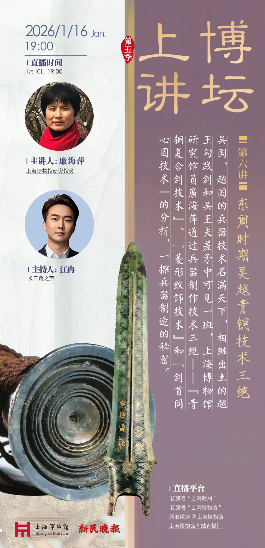 上海博物馆与新民晚报逢迎打造的公益文化品牌——“上博讲坛”第五季第六讲将由上海博物馆探讨员廉海萍,以“东周时辰吴越青铜本领三绝”为题,在1月16日19:00开讲,该讲座通过视频号“上海时刻”、视频号“上海博物馆”、新浪微博@上海博物馆、上海博物馆B站直播间进行直播。