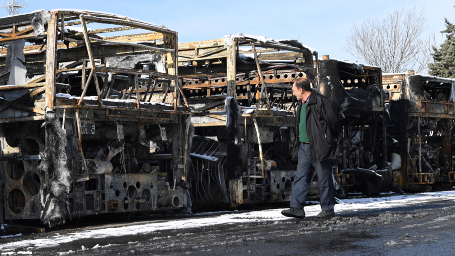 1月21日,在伊朗都门德黑兰,又名须眉走过在近期骚乱中被点燃的公交车。\n 新华社发
